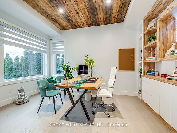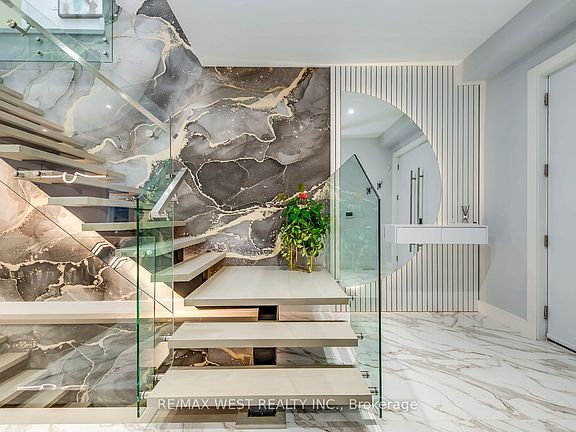 Welcome to this custom luxury home crafted for those who want scale, design and functionality without compromise. Sitting on a rare 52 x 143 ft lot in Yorkdale-Glen Park, this detached residence offers 5776 sq ft of Living Space including a beautifully finished, furnished lower-level suite with private entrance, patio and reliable income. The arrival is impressive: a double asphalt driveway, illuminated interlock pathway and tall double doors open to a foyer wrapped in custom shelving and a feature wall. From here, the home flows naturally into a sophisticated dining room with a statement chandelier, followed by a warm and inviting living room where a sleek fireplace, illuminated media wall, ceiling speakers and custom shelving create the perfect gathering space. The kitchen serves as the true heart of the home, designed with a large Island, high-chair seating, dual sinks, pot filler, wet bar, boutique lighting and ceiling speakers. A walkout leads to a covered deck engineered for all seasons with wind and rain screens, a built-in BBQ with cook-top. Also on the main floor is a stunning glass-walled office with barn-wood ceiling and custom cabinetry. A dramatic skylight crowns the staircase leading to five bedrooms. The primary suite offers a fireplace with built-ins, pendant lighting and a walk-in closet with skylight, custom cabinetry and a full shoe wall. The spa-style en-suite features a glass-enclosed shower with body sprays, an exposed soaker tub and a private water closet. Secondary bedrooms include European built-ins and Jack-and-Jill washrooms, supported by a full laundry room with sink, cabinets and gas dryer. The finished lower level adds three bedrooms, two full baths, a hidden cold room door and a walkout to a private gated patio-currently rented and generating $3,800 per month. Outdoors, the fully fenced yard includes irrigation, cameras, speakers, Jacuzzi tub, shed and a heated double garage with rough-in all ready for a heated driveway.