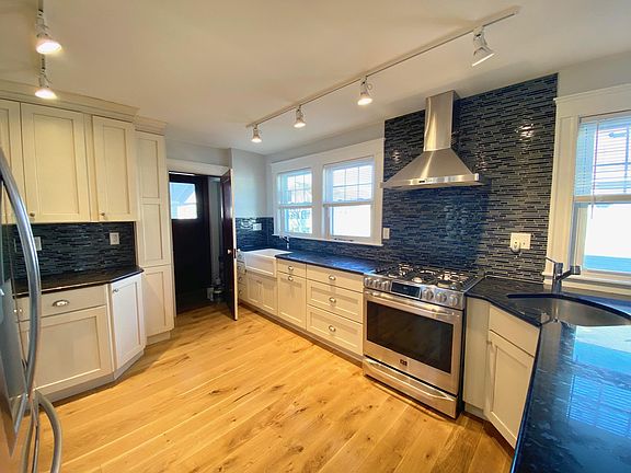 Spectacular 2nd and 3rd floor unit in prime Belmont location. On tree-lined Dalton Road, you are right on the Watertown and Cambridge lines. Previously owner-occupied, this 4 bed, 2 full bath unit has been renovated to the highest standard. Custom cabinets, stainless steel appliances including hood, dishwasher and wine fridge in the open concept kitchen complete with bar seating. Dining room and separate living room with decorative fireplace. 3 large bedrooms on the main level with full bath. Front and back private porches! The third floor boasts a custom, extensive master suite, complete with sitting area, large bedroom, master bath, large walk-in closet with custom skylight, bonus room and laundry room. The third floor has central AC. Gorgeous hardwood floors throughout, updated windows, gas heat. One garage parking space and one additional off-street space. Shared patio and yard in the back. Pet negotiable.