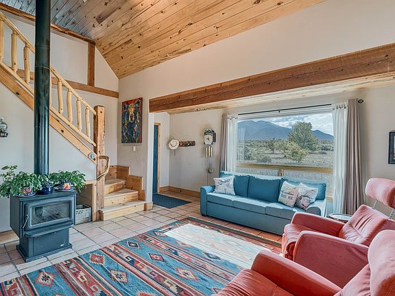 Visualize an early morning dip in the hot tub to enjoy the morning sun from your private courtyard. Better yet, give way to thoughts of the day, sipping that first cup of java, while looking at the majestic Taos Mountain from your porch or large living room window. All this can be yours with ownership of this well maintained territorial style home! This 2 bedroom 2 bath home does not have any wasted space. The open floorplan on the first floor consists of the living room, dining room, kitchen, as well as a bathroom and bedroom. Throughout the entire home you'll see exposed beams with tongue and grove ceilings and tile. The second-floor bedroom and bathroom has an additional living area to use as office space or possibly an exercise area. Some recent upgrades include electric radiant heat upstairs with bamboo wood flooring, some USB outlets, vanity lighting, and RV 240 hook up. The sellers also had garage doors installed and use half the barn as a garage. The barn has 240 electric and water for a possible conversion to a casita. The property contains plenty of wild flowers, trees, and lilac bushes but all easily maintained with a manual above ground sprinkler system. The size of the property gives any future homeowner the vision to make it their own reality! Pack your bags!!