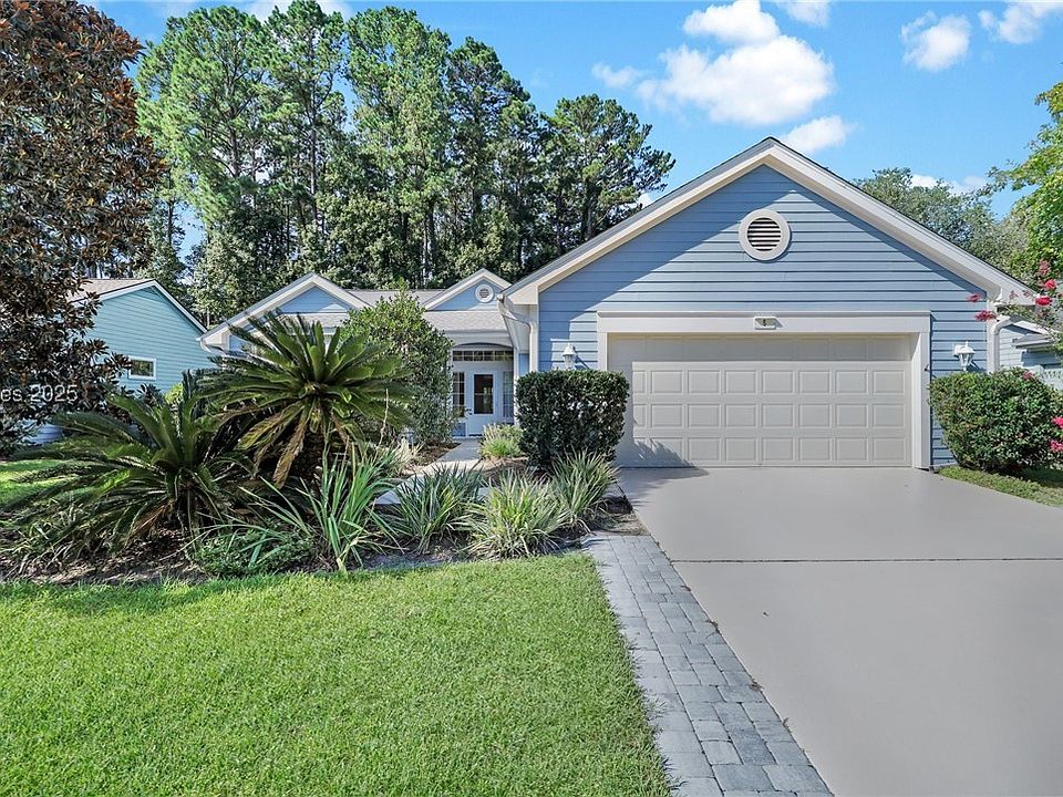 Discover comfort and convenience in this delightful 2-BR, 2-BA home located in a gated 55+ community. Enlarged Franklin/Whitney floor plan is a few steps away from the walking path, and close to restaurant & golf course. Spacious open floor plan with airy Living Room w/slider to Carolina Room & patio; kitchen w/clerestory windows, updated appliances, pantry, Corian countertops, cozy dining area w/bay window; primary suite w/bay window, two closets, and tiled shower. Guest area w/adjacent full bath. Small office room. Relax on the patio overlooking wooded grounds. Enjoy all the amenities that Sun City Hilton Head has to offer! Come and play!