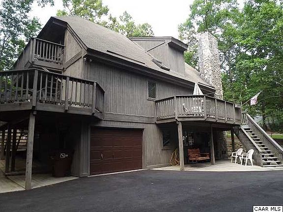 HONEY, STOP THE CAR! Unique custom built Lindahl cedar home surrounded by Lake Monticello's PGA golf course. Wonderful weekend getaway or permanent home. Soaring tongue in groove ceilings will take your breath away! Light filled home built for entertaining and relaxation! 4 bdrms, 4 full bths, terrace level rec room with wet bar and wood stove, decks off all bdrms, oversized 1-car garage, ext. shed, gorgeous wood burning fireplace. Walk to the golf course clubhouse! Short drive to beach 3!
