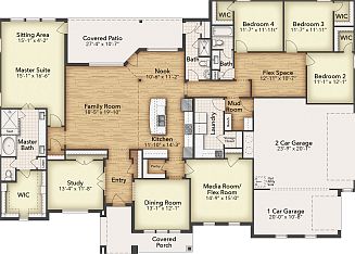 Riverside Homebuilders believes you can have luxury and convenience in a single-level floor plan. The Bosque is proof! With more than 3,200 square feet, this home design blends spaciousness with easy flow from room to room. The open concept in the main living area is the hub and heart of this home. The massive family room blends with the dining room and kitchen, so no one is left out during family gathering time. The kitchen presents plenty of workspace, including the large center island. The walk-in pantry expands your storage capacity, with everything you need just steps away. Just beyond the main living area, the Bosque separates into 3 other wings. The first includes two generously sized rooms with a third one opposite the foyer. Do you want a formal living and dining room? Here they are. Maybe you'd prefer a home office, guest room, media center, library playroom, hobby studio, or man cave. With these 3 rooms, you have great flexibility. The master suite occupies one side of the home, just beyond the main living area. Reward yourself with a suite that lives up to your expectations. Picture a private sitting area in your bedroom, where you can quietly enjoy a cup of coffee along with the view of your backyard. Add the spa feeling of a master bath with both a soaking tub and large, walk-in shower. The Bosque includes 3 secondary bedrooms in a separate wing. They're equally sized and each one offers its own walk-in closet, so you avoid the battles over who gets whic...