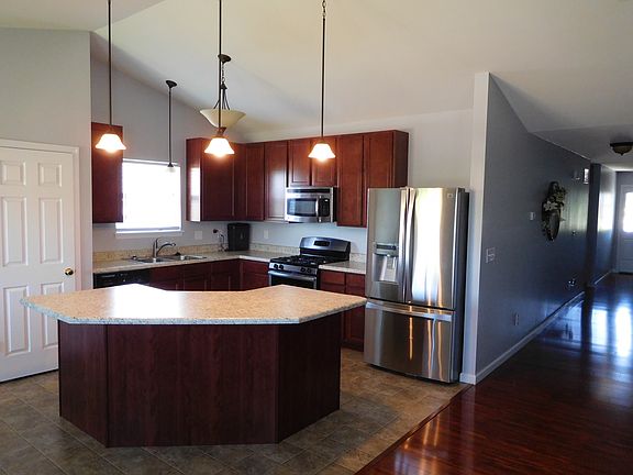 This charming ranch will catch your eye. Immaculate open floor plan includes a split bedroom concept with a Master Suite measuring (13" -1" X 17"- 4"), two additional bedrooms with spacious entry closets measuring ( 12"-4" x 10"-10") and two full baths. The Master suite consists of a walk-in closet, dual vanities, tub, stand in shower, and private toilet. Through the grand entry way opens to a generous main level with vaulted ceilings, fresh painted walls, new laminate flooring throughout, vent-less fireplace and windows that display the substantial backyard. The main level is adjacent to the luxurious kitchen with 42' upgraded cherry cabinetry, enlarged island, natural colored counters, and new stainless steel appliances (gas range, refrigerator, and microwave). Appealing breakfast nook overlooks backyard through the sliding glass doors. Lower level features insulated walls, prepared plumbing for future bathroom, and generous storage areas. 3 car garage. Community Center with Pool. Close to SAFB, Highway 64, shopping, and O'Fallon School District.