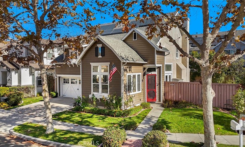 This beautifully renovated single-family home, located in the desirable Oak Knoll Village of Ladera Ranch, offers a bright and inviting atmosphere with modern upgrades throughout. Nestled on a quiet cul-de-sac, the home boasts a charming grassy front yard and an attached two-car garage with built-in storage. Upon entering, you'll find an open dining area with soaring two-story ceilings and French doors that lead to the side yard, filling the space with an abundance of natural light. A stunning wood beam paneling, recently added in August 2024, creates a seamless flow between the dining and living rooms, enhancing the open-concept layout. The home also boasts plantation shutters throughout, which were installed in August 2018, and new luxury vinyl flooring and baseboards on the first floor, completed in January 2024. The formal family room, located to the left of the entry, features new custom-built cabinetry in both the family room and dining room nooks, installed in March 2024. The living room is anchored by a beautiful fireplace, perfect for cozy evenings. Extra storage space is available with an under-stairs closet, adding practicality to the first floor.