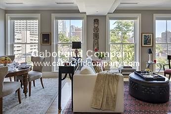 This elegant Penthouse Duplex is in a boutique, landmark elevator building, located in Boston's charming Bay Village neighborhood. Reminiscent of a Parisian apartment, this jewel box of a home is exquisitely appointed throughout. There is a welcoming limestone foyer that brings you into the open living/dining area, offering breathtaking city views through its floor to ceiling windows. There are gleaming hardwood floors, a wood burning fireplace, built-in bookcases and an office niche. The gourmet galley kitchen has brand new, stainless appliances, granite countertops and custom cabinetry. A sweeping staircase brings you to the upper level. The master bedroom has two skylights, generous closet space and built-ins. The guest bedroom doubles as a study with built-in bookcases and French doors leading to a private terrace. The sumptuous, tiled bath has been fully renovated. Direct access to the common roof deck, in-unit laundry and additional storage in the basement. Rental parking nearby.