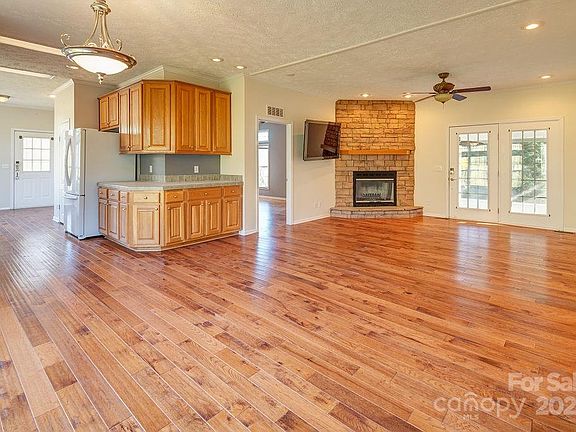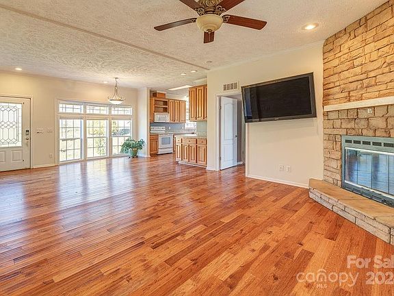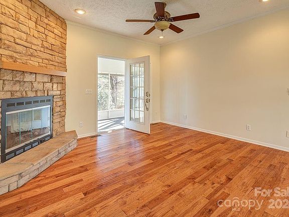 Charming home nestled in the countryside with vibrant landscaping, mountain views, and a low-maintenance half-acre lot. Offering a perfect blend of comfort and rustic appeal, this home features beautiful hickory hardwood floors throughout and 9-foot ceilings. The open floor plan, full of natural light, features a spacious kitchen with long countertops and ample storage. The large living room is inviting, centered around a handsome stone hearth. A large sunroom offers views of the mountains and is perfect for relaxing year-round. The primary bedroom is a peaceful retreat, with a luxurious garden tub in the ensuite bathroom. A bonus room with a walk-in closet provides extra space for your needs. The home’s exterior features multiple doors leading to a deck, a fully fenced yard, and a handy storage shed. The neighborhood is not in a floodplain and did not flood during Helene.