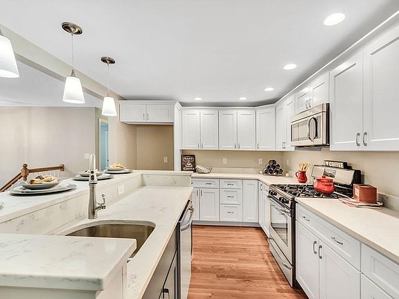 Gorgeous remodeled 3-4 bedroom Split Entry with garage under located in a highly desirable Burlington neighborhood! Newly renovated kitchen with tiered island, quartz counters, hardwood floors, and stainless steel appliances open to dining room. Step down sunlit family room with hardwood floors, ceiling fan, and vaulted ceiling with slider to deck overlooking your private back yard. Fireplaced living room. Master suite features private bath with beautiful walk in tiled shower. Finished lower level with half bath, fireplaced den, and potential 4th bedroom/office/playroom. New windows, gas heating system, central air, siding, and roof.