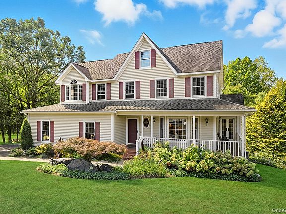 Exceptional Colonial style home nestled on over an acre of meticulously maintained lush landscape. This home exudes charm and sophistication, featuring a wraparound porch, ideal for enjoying serene afternoons. Inside you will be captivated by the abundance of natural light that floods throughout with exceptional oversized windows. Perfect for entertaining, the living room and dining room flow effortlessly into the beautifully appointed galley kitchen which opens to a magnificent oversized 12x32 ft deck with picturesque views of the semi-private level landscaped back yard. Enjoy evenings in the comfortably sized family room with wood burning fireplace offering cathedral ceilings and filled with bright sunlight. With a well thought-out layout, this residence boasts a luxurious primary bedroom with walk in closet and ensuite bathroom, two additional bedrooms and a versatile den/study. Located in a desirable neighborhood, you are just 4.7 miles from the Metro North train station, offering easy commuting options. Enjoy close proximity to parks, restaurants and a wealth of amenities, making this not just a home, but a lifestyle. Don't miss your chance to own this property that defines natures tranquility.