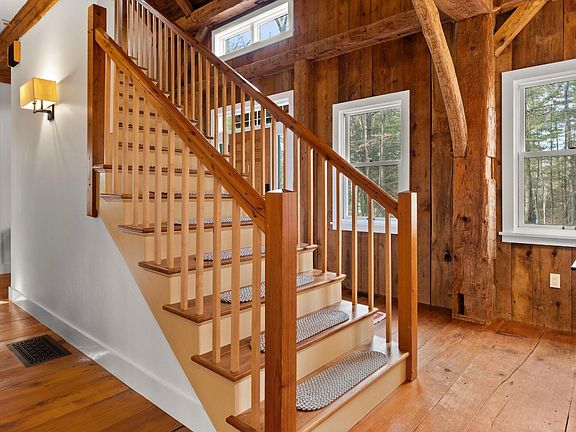 IMPRESSIVE 1840's TIMBER FRAME BARN CONVERSION with large open living spaces and exposed beams, has the perfect location! Outstanding construction blends old with new, built by a premier local timber framer D. Lanoue, with modern amenities which include a chef's kitchen, fully renovated bathrooms, A/C, new granite front steps, new roof, and complete with a Level 2 EV charger. The lower level with walkout, makes a great recreation area, with separate workroom and lots of storage. The fenced yard is bordered by woods, affording