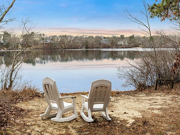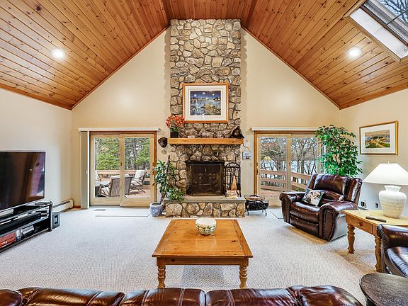 Flax Pond Contemporary with water access! This home was built for entertaining. The Great Room is centered around a floor to ceiling river stone fireplace with two sliders out to the deck that overlooks Flax pond. The great room has a built in wet bar. This room abuts the cooks kitchen with dining area and views of the pond. The formal dining and living room flows easily off the Kitchen with another slider and deck access. The first floor bedroom has two closets and a large bath with shower, whirlpool and a two sink vanity. This is first floor living at its finest. There is a slider to the private deck with views to enjoy your morning coffee. Beautifully maintained this home has two guest rooms separated by a den or home office upstairs and a full guest bath. The walk out lower level unfinished and is ripe with potential with several sliders to the back yard . There is plumbing already installed for a future bath room. There is a two car garage and oversized driveway for all the anticipated guests!