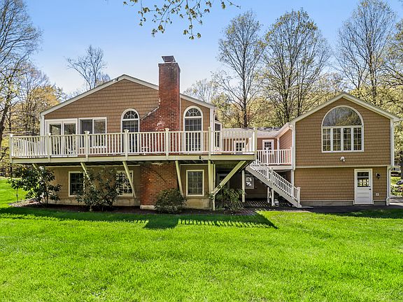 Updated contemporary ranch with fabulous open floor plan! Skylights, vaulted ceilings, and arched windows in living room/great room with fireplace and french doors to fantastic wrap around deck overlooking rolling lawns. Stunning updated kitchen with stainless steel appliances, granite counters, breakfast bar, and hardwood floors opens to dining room with fireplace and bay window. Additional main level family room with vaulted ceiling and french door to deck. Sunny master bedroom with beautiful arched windows and large full bath. Ensuite with full bath and walk-in closet. 2 more spacious bedrooms on main level and hall full bath. Finished lower level recreation/play room with fireplace, office/den/bonus 5th bedroom, laundry room, and half bath. New Well, new A/C, new garage door openers, new insulation, 3 car garage, huge storage room, shed, and wired for generator. Great commute location close to train, schools, stores, restaurants, Route 7, and village center. A little over an hour from NYC and easy commute to Stamford and White Plains. Stunning, open, updated ranch, not to be missed!