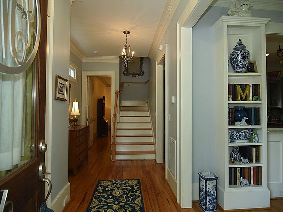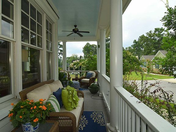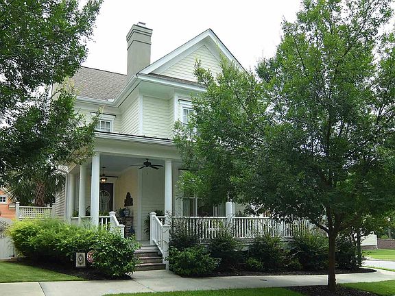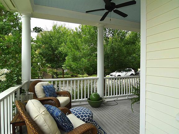 Welcome to 6 Gillon Lane. Our home sits on a Charleston-inspired, tree-lined street in The Village district of Woodcreek Farms. It sits on a corner lot with an inviting wraparound porch. Landscaping is minimal yet complimentary to the home. The fenced back garden between the house and detached garage is hardscaped with defined beds of annuals and perennials. Above the two-car garage is a fully furnished studio apartment with kitchen, laundry room, full bathroom, queen bed and two walk-in closets. The house offers two main bedrooms, one on each level, and an upstairs den.