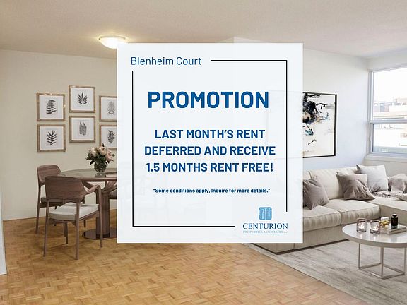 AboutLocated at the heart of East York in Toronto, Blenheim Court Apartments has 1 bedroom apartment, 2 bedroom apartment, and 3 bedroom apartment options for rent with ample storage. Situated at 6 Grandstand Place, near the Thorncliffe Park Drive and Overlea Boulevard intersection, the building features suites with hardwood floors and large windows that provide ample lighting. PROMOTION: Last Month's rent Deferred and receive 1.5 months rent FREE!*Some conditions apply, please inquire for more details.*Looking for a future move-in date? Give us a call today to speak with one of our Customer Care Representatives to find out more!Suite offers:Parquet and ceramic floorsKitchens include full-sized fridge and stoveSpacious with ample cupboard and closet space with walk-in closets in some suitesBalconies in most suites for an extended living spaceProperty offers:Small pets are welcome ask for more details onsiteCovered and surface parking options Full-sized, energy-efficient, SmartCard-operated laundry machines on main levelWheelchair AccessElevatorsVideo surveillance your safety is important to usDedicated onsite staff Your community offers:Easy access to TTC and DVPWalking distance to East York Town CentreNearby grocery stores, pharmacy, and restaurants Close to the local public library and parks: RV Burgess and LeasideFees:*Heat and water included*Outdoor Parking: $60/month *Underground Parking: $80-$100/month *Inquire for more detailsDon't miss out on being one of our valued residents. Contact our Customer Care Centre to find out more details and schedule a viewing today! Suite images shown represent standard unit finishes, which may differ between units. Suite layout varies.Utilities IncludedHeatWater