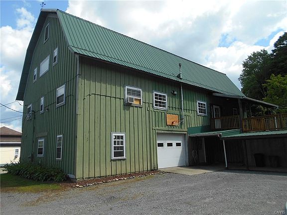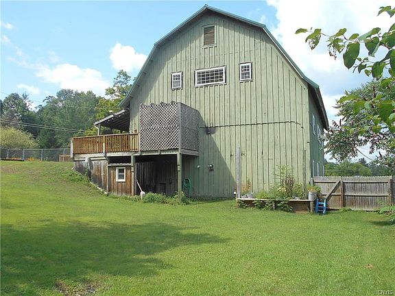 You won't want to miss this fabulously renovated barn style home with open layout and 18' cathedral ceiling. It's located in the Village of Marathon yet secluded for privacy. Enter through the covered porch with wrap-around deck that's ideal for a cook out and entertaining. Once you walk inside, it's a whole new world. Hardwood floors and plenty of natural sunlight make you feel right at home. The large kitchen with stainless steel appliances has lots of storage as well as a walk-in pantry. There is access to the side deck through the kitchen. Eat in the dining area or at the breakfast bar. There is also a breakfast nook for a table and chairs. Two bedrooms downstairs with a full bath or you can call the primary suite upstairs, that overlooks the entire downstairs, your own little sanctuary. The yard is fully fenced in. The lower level laundry room is spacious and there is room for a workshop and other recreation where there is also a half bath. Electric heat, propane heater and pellet stove keep it cozy in the winter. Centrally located to Ithaca, Cortland, Binghamton and minutes to I-81 and shopping.