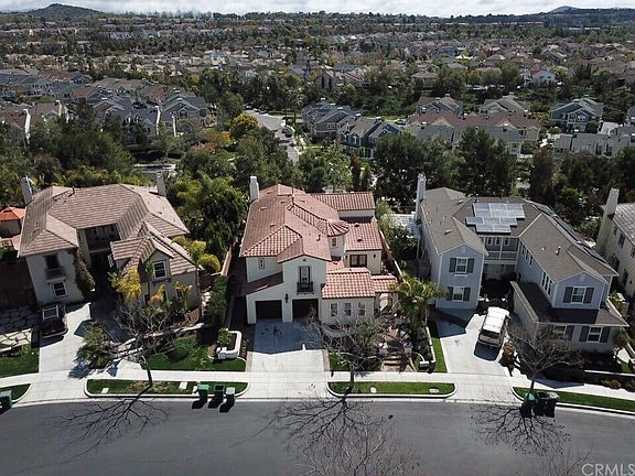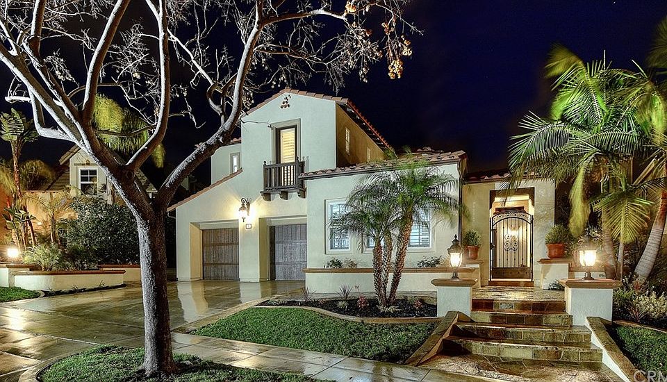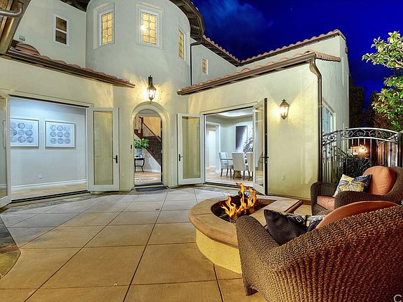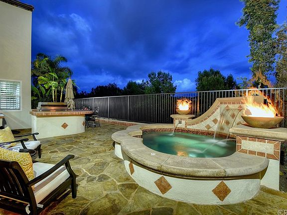 A spectacular backdrop of shimmering city light and hill views lends appreciated appeal to this luxurious home at Tamarind in Ladera Ranch. Extensive hardscaping and mature landscaping enliven the front yard, creating a delightful welcome for friends and neighbors. The views take center stage outback, where massive stone patios reduce water use and increase space for memorable entertaining. A waterfall and dramatic fire pots embellish an oversized Pebble Tec-finished spa, and a festive built-in BBQ center features bar seating and sink. A separate entry courtyard with fire pit provides a relaxing spot for socializing, and custom lighting adds a touch of magic after dark. Custom interior design harmonizes with the home's Spanish-inspired exterior and includes a rotunda entry with mosaic tile floor, wrought-iron detailing, plantation shutters, vaulted ceilings, leaded-glass windows, and wood and Spanish tile flooring. Entertain stylishly in a formal dining room with French doors to the courtyard, and enjoy casual get-togethers in the fireplace-warmed great room. Explore culinary endeavors in a grand kitchen with island, walk-in pantry, breakfast bar, nook and white cabinetry. Approx. 3,900 s.f., the 2-level residence showcases 5 bedrooms and 4 baths including a main-floor bedroom. For a romantic escape, the master suite offers a retreat, opulent bath and walk-in closet. Highlights continue with a loft and 3-car garage.