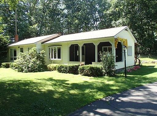 One of the best spots in Pelham, 5 minutes from downtown Amherst in a very desirable neighborhood. This little yellow ranch house, situated on a large, very private, sunny lot with pine trees, open gardens and lots of lawn and plantings, started as a trailer home. In 1975, the sturdy house frame was actually built around it, a full basement dug and poured below it, and 2 porches and an additional room added to the back and front of it. It has a camp feel, gets lots of sun, and feels like a getaway. The land goes all the way across a shared private driveway. The house interior could use some imagination and workmanship--maybe remodeling the layout to reconfigure new spaces? The interior and septic system haven't been updated, although the furnace, electric box and roof are about 10 years old. This is priced to sell and is being sold as-is. The sellers will consider all offers, so come by and take a look--so much raw potential. Oversized detached 2-car garage with workshop, 2 sheds.