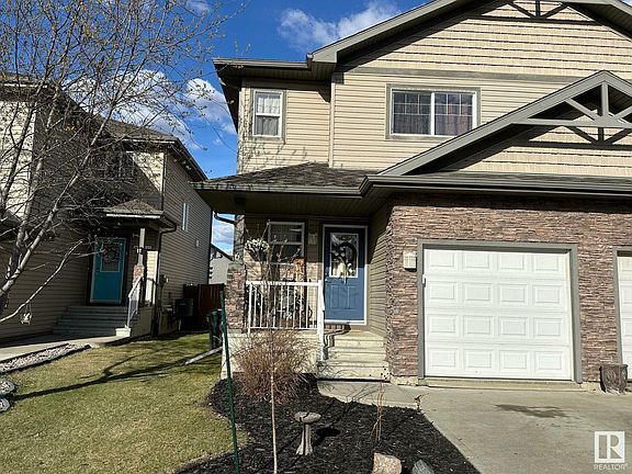 NO CONDO FEES !! RARE FIND, HARVEST RIDGE 1/2 DUPLEX With DUAL MASTER SUITES!! Yes two extra large upstairs master bedrooms each with private ensuite bathroom & walk in closets, separated by a convenient second floor laundry room! Located in a quiet cul-de-sac with mature trees, stone front features, covered front porch & long driveway that can fit a full sized truck. Single attached insulated garage, large back yard with deck & fire pit. Bright open concept design, living room with gas fireplace, Island kitchen with eating bar & corner pantry, Dining nook adjacent to the patio doors overlooking the deck & backyard. Unfinished basement with roughed in bathroom. High efficiency furnace & hot water tank. Great location !! close to schools & tri-leisure center with fast Yellowhead hwy access. Second Master Suite Options: Extra revenue from a Renter, Shift worker quiet room, Children's bedroom with private bathroom, Nursery, Work at home office space, TV family room, Hobby room, Workout / Exercise room.