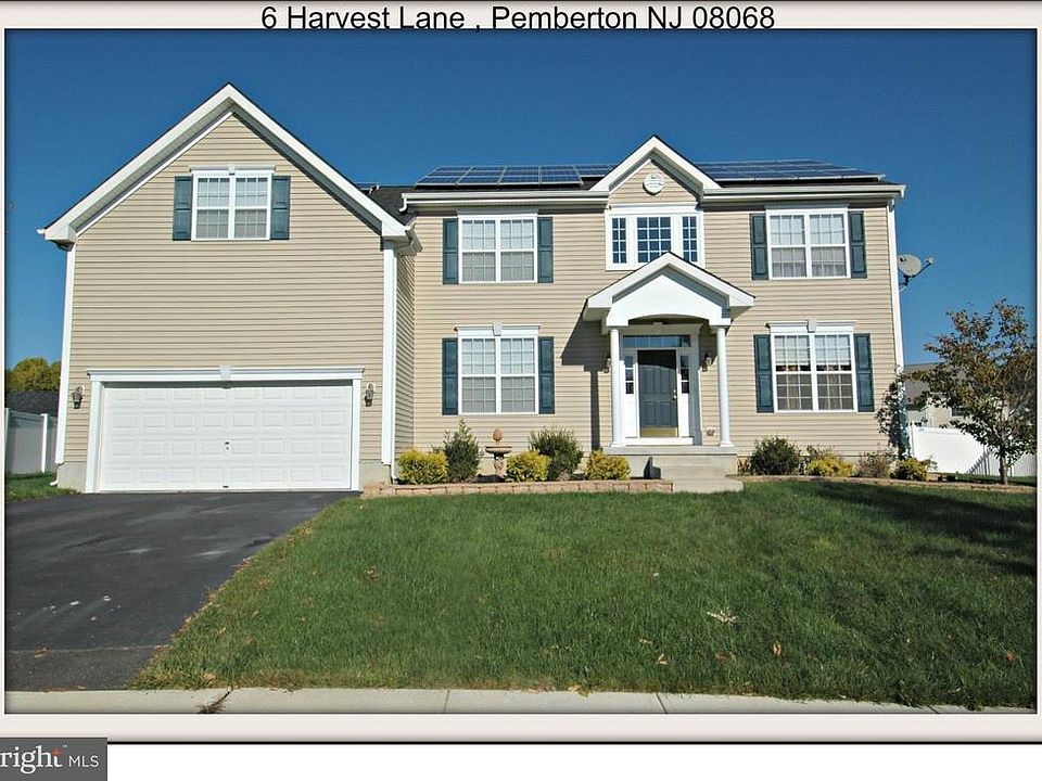 Over 3500 square foot home minutes from the Joint Military Base. This beautiful Randolf Model has 4 bedrooms, 2 full baths, and one half bath. The home has hardwood floors, ceramic tile, custom tray ceilings, custom trim, ceiling fans throughout, and upgraded lighting throughout most. Enter through the grand foyer to formal living room complete with cathedral ceilings, custom windows, and gas fireplace. The great room is open to a totally the upgraded kitchen with center island, stainless steel appliances, granite countertops, well lite pantry, and upgraded cabinets. The kitchen leads out to a large morning room with a slider door to the custom paved patio. There is an outdoor covered entertaining area in the large vinyl fenced in yard. There is also an entrance from the two car garage on the main level as well as a study, large laundry room, and upgraded half bath on the main level. Upstairs there are 4 bedrooms, 2 full baths and extra closet space. The owners suite is complete with custom gas fireplace, make up area, two walk in closets, and full bathroom with Jacuzzi tub. Down to the unfinished basement for an additional approximate 2000 square foot storage area. The home has existing solar panel system for economic utility bills. Close to all major shopping, transit, Joint Military Base, Atlantic City, Philadelphia, New York, and the beautiful Jersey Shore.