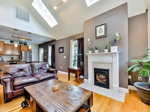 Soaring cathedral ceilings flooded with light enliven this 2 bed penthouse condo with 2 parking spaces. Open floor plan encompasses living room with fireplace, hardwood floors, dining area and kitchen. Two bedrooms with large walk-in closets. In unit laundry, private rear deck and bonus private walk up attic for storage or future potential. Entry staircase with room for coats and shoes on 2nd level. Kitchen with tiled back splash, Viking gas range and breakfast bar. Common back yard area, basement storage. Central air, lively location mins to Brewery, Stony Brook or Green St. T, Centre St, or neighborhood park. Full de-lead compliance. Many recent updates: '18 Fridge, '16 hot water, '17 paved driveway, Open Houses: Thurs 11:30-12, Sat & Sun 11:30-12:30. Any offers reviewed Monday 2 PM.