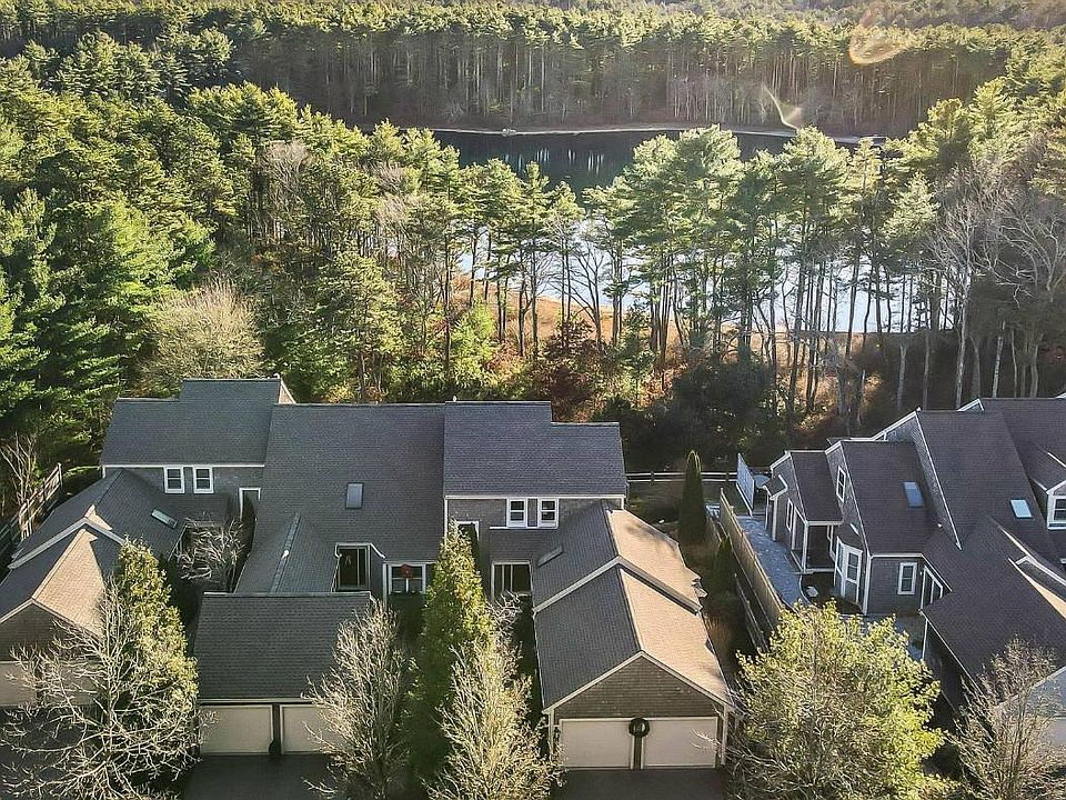 Welcome to Rebecca's Landing in Pinehills. Privacy and elegance await you in this end unit overlooking Clam Pudding Pond. This light and bright T model home has an open floor plan for easy living featuring beautiful Bamboo floors. Main suite with cathedral ceiling, walk in closet and private bath with hot tub. Gourmet kitchen with stainless appliances and granite counter tops opens to a cozy family room with a gas fireplace with granite surround, leading to the private courtyard. Combination dining room/living room with wall of windows with access to a large deck with pond views. Upstairs you will find a spacious loft perfect for an office with a second bedroom and a full bath. Recent improvements include a new roof 2023, new water heater 2023, new fridge 2023, new front load washer 2023, new gas stove 2022. Surround sound system throughout. Walking distance to Clam Pudding Pond and steps to 2 pools. Bring your kayaks and enjoy the amenities The Pinehills has to offer!