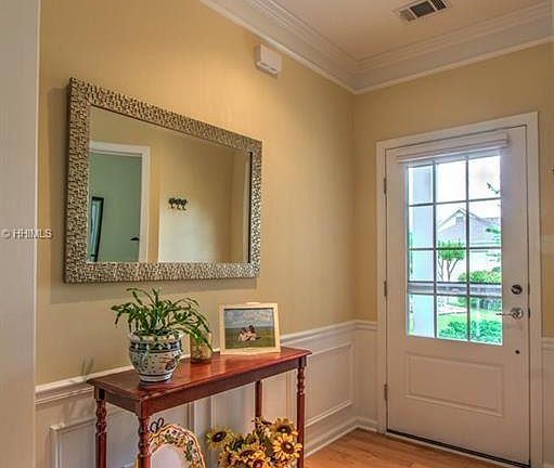You will love this house from the moment you walk in the front door. Gracious entry foyer w/wainscoting, great room w/cornices & crown molding. Den w/French doors. Kitchen, which can be an eat-in, has Corian countertops, stainless appliances, under cabinet lighting & dbl pantry. Tile floored Carolina Room w/double sliders that lead out onto the relaxing three season 15x15 room w/vinyl sliding windows & wood vaulted ceiling w/skylights. Outdoor 10x10 patio! Wood floors in foyer, den, great room, kitchen. Great features include smooth ceilings, extended garage & full staircase leading to over garage storage. Hard coat stucco siding w/ cultured stone accent. Conveniently located to back gate.