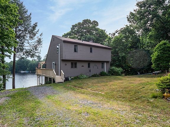 Enjoy striking lake views from most rooms! Open floor plan waterfront contemporary home w/mostly hardwood floors. Cathedral ceiling, lots of glass overlooking the lake, and pellet stove. The 700 SF deck w/pergola is perfect for entertaining or winding down. Convenient 1st fl BR, bath w/laundry. An interior balcony leads you to a large MBR w/walk in closet. Enjoy morning coffee on the balcony w/lovely high lake view. The 3rd BR and spacious full bath complete the 2nd floor. More recently finished is the family room in the walkout basement with luxury vinyl plank flooring, a flush fireplace, bar with granite, refrigerator. Pull-out sewing table under the stairs. Step out from the FR to a peaceful firepit area. Recent mini-split heat/ac units can be found in the living area, all BR's and the family room. Wired for generator that stays. Bring your boat to tie up to your dock, and swim, fish and ice skate from your front yard! This lifestyle could be yours. Come check it out soon!