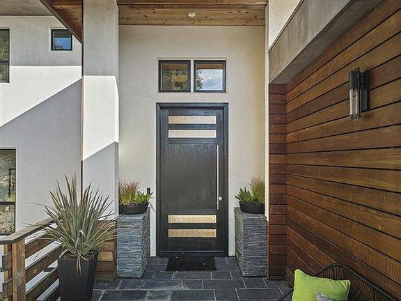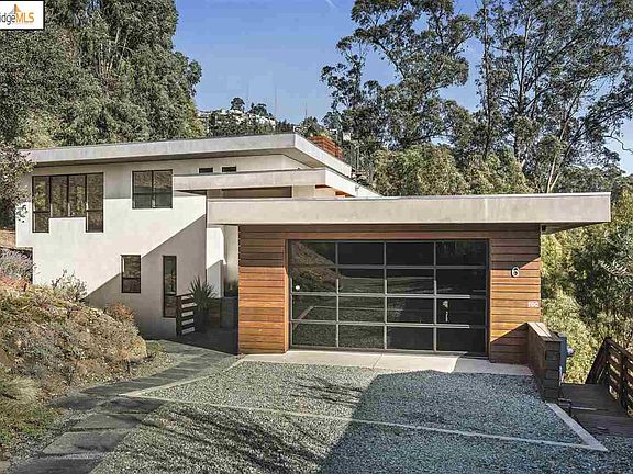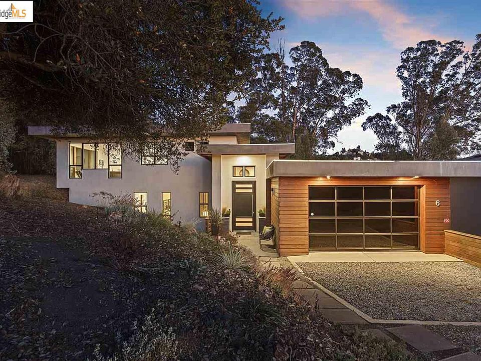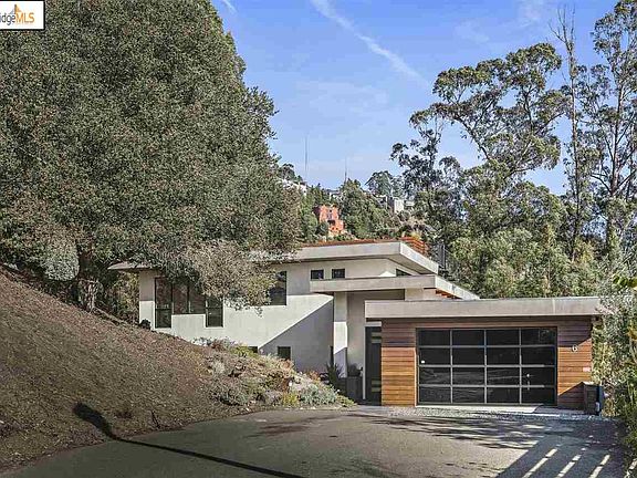 Dramatic design, walls of glass + high ceilings abound in this mid-century modern in the Oakland Hills. Sited on a large parcel surrounded by nature, it was designed by David Allen, architect for the Oakland Museum of Jazz, with emphasis on the environment + sustainable materials. Main level features open living, dining + kitchen area, a lounge, +1 bedroom + full bath. Upstairs, luxurious Primary Bedroom Suite has views into the hills, gas fireplaces, a spa-like luxury bathroom w free-standing tub + walk-in waterfall shower + large closet room. Two addl. bedrooms share a stylish bath. Expansive roof deck/garden + 2 patios create sensational outdoor spaces with breathtaking Bay views. Accessible by separate entrance below, an enormous office suite can function as flex space. 2-car garage with interior access + wide driveway for extra parking. Double lot for max privacy. Located on an exclusive cul-de-sac within minutes of Montclair Village, parks, the SF commute + the great outdoors.
