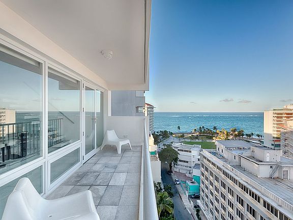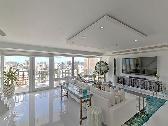 Lofted duplex penthouse located on the 11th floor at Laguna Terrace in the heart of the Condado Beach district of San Juan. Walking distance to restaurants, hotels and the beach. This 3 bed, 3 bath apartment was completely renovated in 2016, with over 2,000 square feet of white glass flooring throughout and two separate balconies. Pearl-white finished countertops, customized kitchen cabinets and a wet bar offer the ultimate in clean, modern living. A floating staircase with LED lights leads to the master suite on the second floor, featuring its own private balcony facing the horizon of the city, an oversized master bath with soak tub facing the water and dual master walk-in closets. An office nook and a reading corner with ocean views, provide a calming and productive working space, and round out this very unique master suite. Laguna Terrace has 24-hour gated security, full backup generator and water cistern, covered parking garages. Residence 11C has 1 assigned parking space and 1 extra large storage room, located parallel to your underground parking.