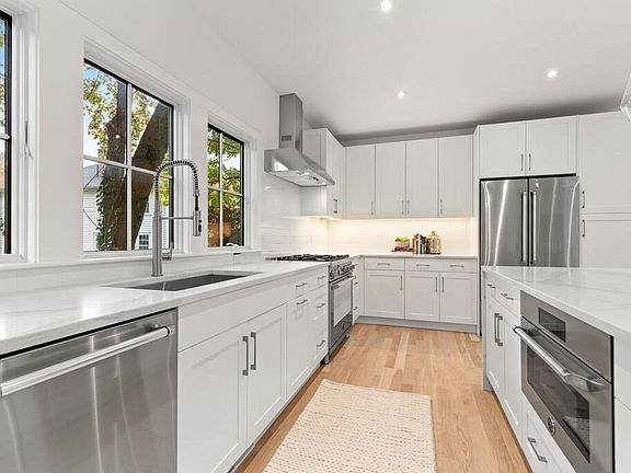 NEW CONSTRUCTION! Contemporary farmhouse on quiet side street with 5 bedrooms, 4.5 bathrooms, and attached garage. A stones throw to Wilson Farm, the Minuteman Bikeway, and MBTA bus to the city. The open concept 1st floor includes a chef’s kitchen with Bertazzoni appliances and custom cabinetry, living room with gas fireplace and built-ins, powder room, and dining area with glass slider to patio and yard. Off the living room, enter the stunning private bedroom/office with 14 ft. cathedral ceilings and adjacent full bathroom. Upstairs, 21 windows fill the rooms with natural light. The primary suite features 18 ft. cathedral ceilings, large walk-in closet with custom closet system, and stunning bathroom with oversized shower and custom double vanity. A beautifully appointed bathroom with tub is shared in-between 2 bedrooms. The 3rd bedroom has a private en-suite bathroom. Laundry and large linen closet round out the 2nd floor.