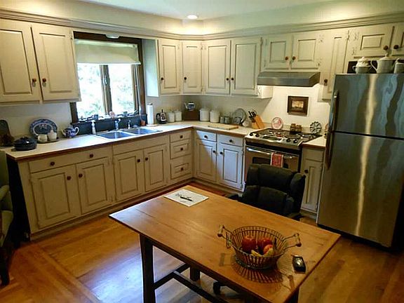 Turn-key homestead! Quality-built home in a very private setting: 200' off road on 5.2 acres. Home features custom cabinets, oak floors, 6-panel pine doors, brick fireplace w/wood-burning stove, updated heat, electric, roof, off-grid solar electric backup, workshop, spacious new master suite, and partly-finished walkout basement. Yard includes greenhouse, refurbished barn, fenced garden with raised beds, mature woods, meadows, and fruit trees.