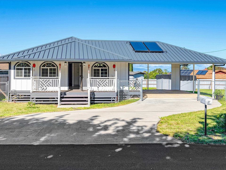 CUSTOM BUILT IN 2021! (NOT CPR'D) Plantation home in the heart of quaint Makawao town offering views of Haleakala, West Maui Mountains and the ocean! This home has a standing metal seam metal roof and an oversized carport. Sited perfectly on this 13,252 square foot corner fenced lot. Excellent floor plan with 2 spacious bedrooms w/ en-suite baths. The main bedroom features a walk-in closet and extends onto the cozy porch overlooking the backyard. The main living area is bright, open and airy with all new stainless appliances, granite countertop in kitchen with under-mount sink, new solar water heating, dual pane vinyl windows and slider door, three filtration water system for the 14,900 catchment and a 1250 gallon concrete septic system and more! Makawao Ranch Acres does not have an active association and there are no monthly dues. This property is situated in close proximity to the rural town center where you can grab your famous Kamoda pastries along with the boutique stores, Makawao library, post office, restaurants and the Eddie Tam Memorial Center equipped with basketball courts, baseball fields, gymnasium, and soccer fields. The current owner planted fruit trees and fenced in the majority of the backyard.