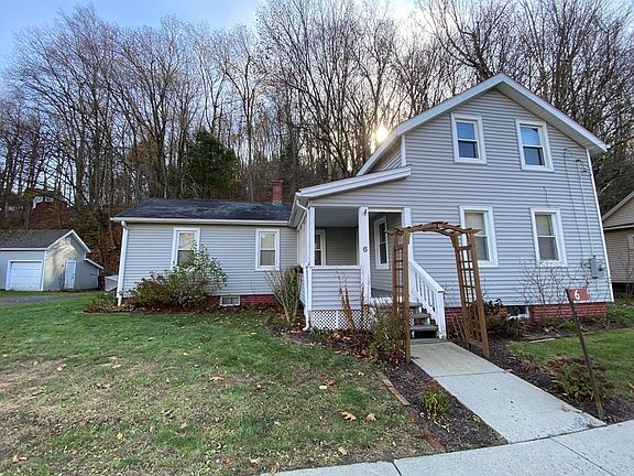 Charm and character galore at this affordable home! Lots of updates to share... newer propane furnace (2008), vinyl siding, replacement windows, and electric panel. The spacious living room features surround sound and access to the adorable front porch. The dining room offers a cozy pellet stove and a cathedral ceiling! The fully applianced & newly renovated kitchen features new cabinets, countertops, SS appliances, a cathedral ceiling and a convenient pantry/laundry room featuring a stackable washer & dryer, both purchased in 2017. The 1st floor primary bedroom offers a surprisingly large walk in closet! The 2nd floor offers 3 additional bedrooms & a hall linen closet. The separate 1 car carriage house measures 16 X 17 and offers lots of additional space w/ a bonus storage area on the 2nd floor. A screened in gazebo provides a lovely place to spend summer evenings and houses the hot tub, which will remain for buyer's enjoyment.