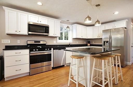 - Kit Dscrp: Main Level, Dining Area, Flooring - Hardwood, Countertops - Stone/Granite/Solid, Deck - Exterior, Kitchen Island, Stainless Steel Appliances, Open Floor Plan, Recessed Lighting, Slider, Exterior Access, Lighting - Pendant