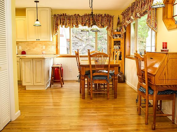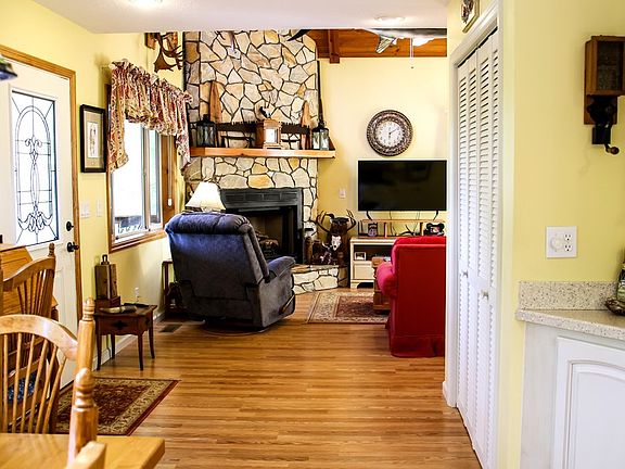 This 3 Bedroom 2 1/2 bath with 2 car garage. The features a stone fireplace that is currently gas but hooked up to a chimney so it could be converted to wood burning if preferred. The vaulted ceiling to the second floor looks down over the living room. Beautiful front deck to enjoy the fantastic view. Guest bedroom on main (could be master, has private bath). Large Master bedroom and bath on 2nd floor with the second deck to take in the morning air and view. 2nd guest bedroom on 2nd floor. The approach is a paved road (not steep) about 6 minutes from town and local amenities. Drive is a half circle with separate in and out. The washer and dryer are currently on the 2nd floor but could be moved to the kitchen (plumbed). Additional attic storage space in the house and garage.