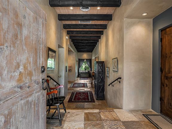 From the moment you arrive, this residence draws you in with its blend of timeless craftsmanship and modern sophistication. Set in the exclusive Puertas enclave of Las Campanas, this soft contemporary home overlooks the 10th fairway of the Jack Nicklaus designed Sunset Course, offering sweeping fairway views and year-round greenery in a serene, private setting. Designed for effortless indoor/outdoor living, with sliding glass doors that recede completely to create a dramatic 16-foot opening, bringing Santa Fe’s legendary blue skies and natural light into the heart of the home. Expansive portals and patios frame multiple outdoor living areas, ideal for entertaining or relaxing, including an in-ground spa. Inside, slate and wood floors, hand troweled plaster walls, and four fireplaces—including two kivas—enhance the warm, inviting ambiance. The open-concept living and dining area flows into a chef’s kitchen featuring high end appliances, granite counters, custom cabinetry, and a walk-in pantry. Adjacent to the kitchen is an informal living or dining area. The luxurious primary suite enjoys golf course views, a fireplace, private portal, spa-like bath with whirlpool tub, separate shower, custom tilework, and a generous walk-in closet. A private guest suite offers its own kiva fireplace and en-suite bath, while the third bedroom/study with built-ins and adjacent bath provides flexible space for guests or office use. Additional highlights include a two-car garage, refrigerated A/C, hand-forged hardware, hardwood accents, and an adobe entry wall with flagstone detail that sets a distinctive tone. Combining rustic authenticity with contemporary elegance, this home delivers the best of Santa Fe living in a true "lock and leave" setting with unparalleled design, fine finishes, and breathtaking fairway views.
