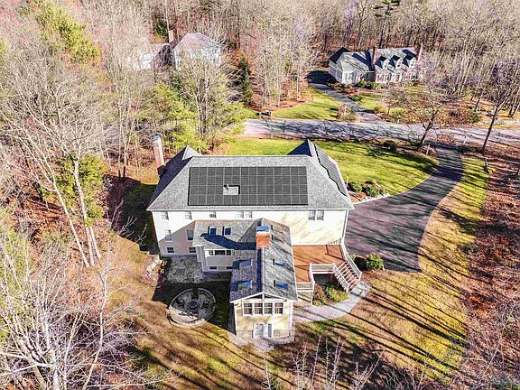 Offer Deadline: 1/14/25 - 5pm. Luxury & Energy Efficiency in Baldwin Farms. This stunning 4 Bedroom, 2.5 Bath Colonial is nestled on a serene 3-acre lot, offering the perfect blend of elegance & eco-friendly living. Enjoy exceptional utility savings, up to $5,000 annually, thanks to owned solar panels and a Bosch Electric Heat Pump/AC system ($80k investment), ensuring sustainability without sacrificing comfort. Step into the welcoming two-story foyer, where fresh paint & updated fixtures set the tone for this impeccably maintained home. Beautiful hardwood floors flow through the formal living room, featuring a wood-burning fireplace w/an efficient insert. Adjacent, the formal dining room leads to a chef’s dream kitchen equipped w/a Wolf 6-Burner Range & Custom Hood, Dual Wolf Wall Ovens, Dual Subzero Refrigerator Drawers, pantry & Dual Dishwashers. The kitchen spills into a spacious dining area, where a 2nd fireplace is warm & inviting. Family room complete w/radiant floor heating & panoramic views. The first floor also features a private home office & half-bath with quartz countertops & marble flooring. Upstairs, the primary suite boasts a walk-in closet and a spa-like en-suite bath w/granite counters, a tiled shower & tub. 3 additional bedrooms, second-floor laundry, & a bonus room complete the upper level. With its stunning design, modern upgrades & eco-conscious amenities, this home delivers a lifestyle of luxury & efficiency in a tranquil setting.