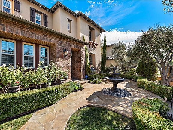 Settled behind a beautiful stone wall near the end of a peaceful cul-de-sac, this extraordinary Ladera Ranch home reveals a host of custom upgrades & a prestigious address in guard-gated Covenant Hills. Like classic estates in Beverly Hills, a long flagstone driveway leads through a Porte Cochere to a private motorcourt, while an entry patio makes everyone who visits feel welcome. The expansive homesite continues to a private backyard that showcases a pool w/ waterfall & Baja shelf, an elevated spa, flagstone patios, a built-in BBQ, & a loggia that shares a see-through fireplace w/ a fountain-adorned patio off the motorcourt. Inside, an equally impressive selection of bespoke amenities graces a two-story floorplan of approximately 3,900 square feet. Stone accent walls are featured throughout, w/ one reaching the ceiling above a dramatic upgraded staircase, & others embellishing the formal fireplace-warmed living room. Natural light streams through bi-fold glass doors that erase the line between the backyard & the family room, which features a fireplace w/ raised hearth, and a built-in entertainment center with surround sound. The exquisitely remodeled kitchen is destined to please even the best chefs with appointments that are led by porcelain countertops, extensive white cabinetry, an island, tiled backsplash to the ceiling, a custom hood, built-in KitchenAid refrigerator and stainless steel Bosch appliances. A first floor bedroom with ensuite bathroom and powder room complete the first floor. On the second level you will find four bedrooms, each w/ an ensuite bathroom including a luxurious primary suite that pampers homeowners w/ a sitting room/office, a sunny deck w/ spiral staircase leading to the backyard & pool below, & a walk- in closet w/ built-ins. Elegance is the hallmark of the primary bath, where marble countertops shine on individual vanities, & a soaking tub & separate shower elevate daily routines. Powered by a rooftop solar system, this turnkey home is further distinguished by custom crown molding, a custom barndoor at the powder room, plantation shutters, a large laundry room w/ sink & designer floor tile, a split three-car garage, soft water system & new luxury vinyl plank flooring throughout. Enjoy a location that is just a short stroll from neighborhood parks, a community garden & scenic paseo walkway. Covenant Hills’ clubhouse is close by, and award-winning schools provide acclaimed educational opportunities for all grade levels.