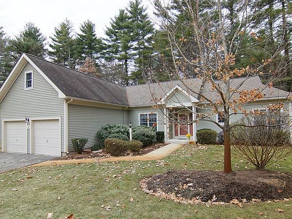Huckins Farm Condominiums! One-level living at its best in this end unit, Bedford Model. Sunny and quiet, this privately sited home, with attached two car garage, is located on a lush, green cul-de-sac. Open floor plan, bright and light spaces, cathedral ceilings, fireplace, and walk up storage over the garage are just a few of the amenities offered. The large, eat in kitchen opens to a 3-season porch leading to the back yard. A private study features french doors. The oversized master bedroom space is open and airy with 2 walk-in closets, and an en-suite bathroom with a Jacuzzi-style tub and separate shower. The pristine Huckins Farm complex offers walking trails, horse paddocks, stone walls, an outdoor pool, tennis courts, club house, exercise room, and even a hot tub. Welcome to easy living both indoors and out!