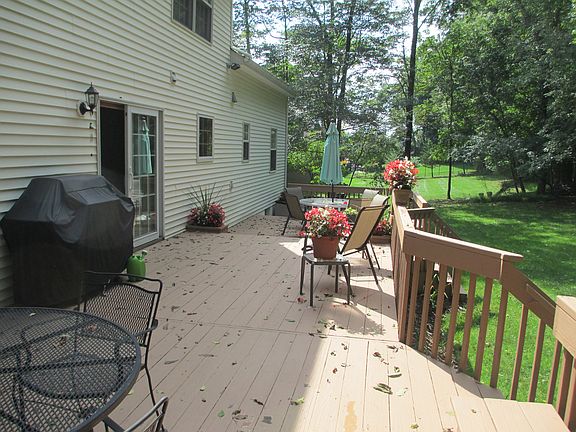 Thanks to the well designed floor plan, so much value and appeal is created withon the flow of this beautiful Colonial. With a 2 story entry and winding staircase to second floor, your are greeted with grandeur. Beautifully updated Kitchen with Granite, stainless steel appliances, recessed lights and opens wide to the Family Room with fireplace. Oversized Formal Dining Room with hardwood floor, crown molding and bay window. Upstairs the Master Suite will not disappoint, with the bath featuring a skylight and jetted tub. The other 3 bedrooms are very generous in size with either huge or walk in closets. Outside you have a substantial deck that practically runs the whole length of the house, and backs to woods for added privacy. Also included: Central Vac, alarm system, public utilities, intercom, multi-zone HWBB gas heat, and 1 year home warranty for the buyer.