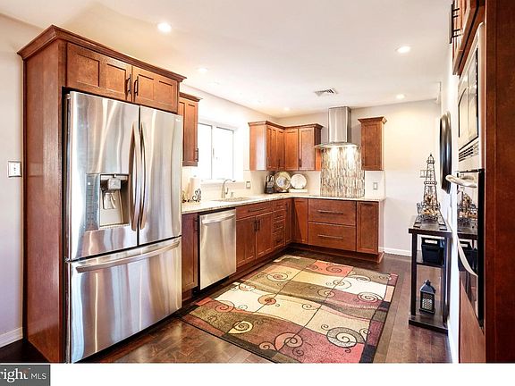 You have got to see this Trappe Boro rancher to believe it! The home has been gutted, updated and expanded with outstanding attention to detail. Dining room and master suite with walk-in closet and full bath, a full finished basement with a kitchenette, full bath and bedroom as well as a large entertaining space have all been added to the original home. The basement adds over 1000 sq. ft of living space and is fantastic as in-law suite or an awesome party space. The main floor has 4 bedrooms, 2 full, remodeled baths both with zero entry showers, quartz tile and natural stone. The large gourmet kitchen is a chef's dream with stainless steel appliances, granite countertops, glass tile back splash, stone sink, cherry hardwood floors, custom cabinetry and a beautiful island. Off the kitchen is a dining room with sliding glass doors that lead to the patio, backyard and 16 X 32 built in pool. Enter through the front door (which was moved to have easier access to the driveway and garage) and you will step into 19 X 21 Great room with stone fireplace complete with a wood burning insert capable of heating the whole house. The roof is 2 years young, all windows have been replaced and the home has 3 heat zones all with their own heat pump back-up system. This rancher is energy efficient and has tons of storage space not only in the basement with a floored, heated crawl space but attic storage as well. Plus, there are 2-garage bays with heat! Ideal for any car lover! The garages have attic storage and the current owner added an RV pad alongside the detached garage. Make your appointment today to tour this one of a kind ranch home!