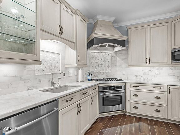 The gourmet kitchen boasts quartz countertops with modern, high-end appliances. The kitchen opens to both dining and living areas with large windows looking out to the Cape Fear River. Living area features built-ins alongside a cozy fireplace creating a perfect entertainment area.