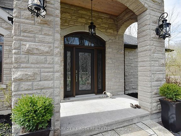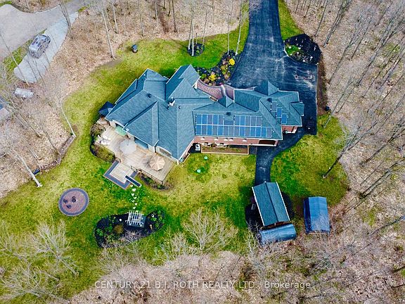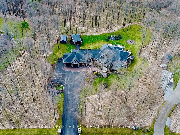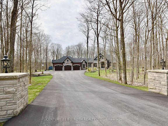 Welcome to the grand luxury of Simcoe Estates embodied in this custom-built bungalow, privately nestled on a 1.956-acre estate with over 5000sq.ft of finished living space. Upon entry, gleaming hardwood floors guide you through the main level, complemented by crown moulding that flows throughout. The heart of this home is the custom chef's kitchen, featuring a large leathered granite island adorned with walnut cabinetry that offers storage all around. Polished granite surrounds the kitchen area, highlighting professional-grade appliances that enhance the culinary experience. Step outside from the kitchen area onto a covered patio, where you can enjoy al fresco dining, host gatherings, or simply unwind in a tranquil setting surrounded by nature. The primary bedroom features a luxurious 5-piece ensuite with heated floors, creating a spa-like retreat. Step out onto the walk-out patio directly from the bedroom, where you can enjoy seamless indoor-outdoor living and unwind in the hot tub. All bathrooms on the main level boast ceramic finishes with quartz counters, while the basement showcases granite counters, elevating every detail of this exceptional residence.Stunning finishes define every corner, emphasized by the 12-foot ceilings in the foyer and great room. The expansive 4-car garage not only provides ample parking but also includes a separate entrance into the basement, adding convenience and flexibility to the layout. Additionally, a generous 9-foot ceiling height in the basement blurs the distinction between lower and upper levels, making living in this space akin to being on the main floor.This home is a testament to quality craftsmanship, with a myriad of upgrades that enhance both form and function, too numerous to enumerate here. You simply must experience this home firsthand to appreciate it's full splendor. Don't miss out on this extraordinary opportunity, schedule a viewing today to witness luxury living at it's finest in Simcoe Estates. **EXTRAS** Solar