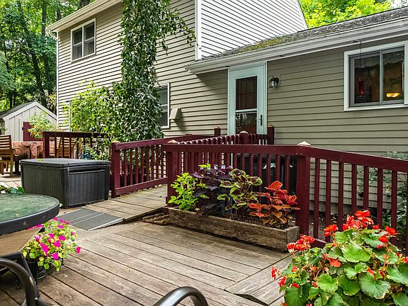 You will be surprised! Absolutely charming contemporary home framed by lush landscaping & gardens that have maximized this lovely property. Warm & welcoming, this home boasts open concept dining area & kitchen, hardwood flrs, fabulous great room w/cathedral ceiling & wood burning fireplace & separate sitting/computer area w/sliders to expansive decks for full enjoyment of the fantastic backyard. There are two bedrooms on the 1st level w/hardwood & updated 3/4 bath w/oversized tile shower that can offer one floor living. Custom barn door off the sitting area leads to private & peaceful 2nd floor master suite w/vaulted ceiling & views of the lovely yard. Full master bath w/tile completes the 2nd floor. LL features a finished family room offering versatility for work/play or guest space w/gas stove, built-ins & walk in closet. Enjoy the custom built-in wine cabinet/bar for entertaining. Custom appointments thruout & lovingly maintained. The unfinished area serves the utilities & is currently used for winemaking w/double utility sink for convenience. The garage is open to the unfinished area & currently part of seller's workshop space. This lot has been meticulously designed for outdoor living, gardening, entertaining & pet play. Expansive double decks, separate patio area w/firepit, relaxing hot tub, another sitting area by the koi pond, garden shed, fenced area for pets, hardscaping, herb & perennial gardens & grapevines. Deceiving & delightful home in desirable SAU16.