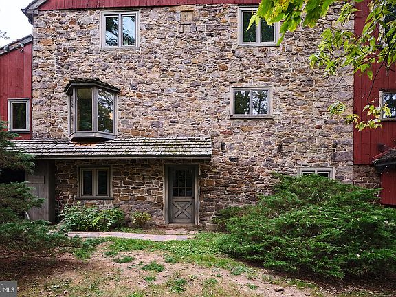 Welcome to Stone Barn, a classic Bucks County stone and frame bank barn built in the early 1800s. Converted to a residence around 1980, this extraordinary home is on the market for the first time in over 40 years. Expansive spaces, soaring ceilings, exquisite old beams, trusses and stone walls  create stunning living spaces and offer many opportunities for a new owner to create their dream home. With four levels, the possibilities are endless. The main level features a gracious entry into the large living area with gorgeous random-width chestnut floors, a wall of windows and sliding glass doors to the terrace, and a stone chimney wall with raised hearth. Off the entry area is a tavern room, with a wet bar, which is a more intimate space with many possible uses including as an office, a library or play room. The expansive dining room can accommodate large dinner parties and has a sliding glass door to the terrace that overlooks the grounds and the stone-walled courtyard area below. The kitchen, breakfast area, a mudroom with stone floor and a powder room complete the main level. Up a flight of stairs the U-shaped second level has a cozy loft with stone walls, the main bedroom suite with a large full bath, a walk-in closet and more of the beautiful old architectural details. There are two additional bedrooms and a full bath on this floor. Up another flight,  the finished third floor has three bedrooms, a full bath and generous storage spaces. The lower level, reached through a door off the entry area, is finished, with four rooms, including one with a brick fireplace, as well as a workroom, a utility room and a room that is rough plumbed for a bath. There are two doors to the courtyard, one opening on to a covered porch. The lower level offers nearly unlimited  possibilities for a new owner! Located just north of vibrant New Hope, Stone Barn has easy access to commuter routes, shopping, recreation activities including walking, hiking, kayaking, and boating, as well as dining and cultural venues . It is 3.5 miles to the center of New Hope; 66 miles to the Holland Tunnel; and 42 miles to Center City, Philadelphia.