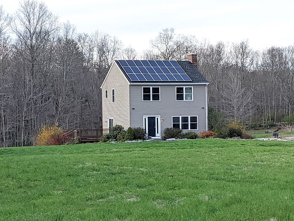 Stylish 4 bedroom Colonial with 3.5 baths features a front porch with a retractable awning, a wrap-around deck and owner owned solar on 3+ acres! This is a great home that will fit many lifestyles. It has a comfortable, easy flow between the main living areas with lots of charm. The kitchen offers stainless steel appliances with ample cabinetry, a glass slider that leads to the side deck perfect for grilling days and a center island with storage space and breakfast bar. Retreat to the dining room area for a more formal dining experience and relax in the spacious living room that displays a large picture window allowing natural light to flow through. Upstairs you will find 3 bedrooms including a private full bath in the Primary and an additional bedroom on the lower level walk-out basement complete with an office, sizeable family room with built-ins and a full bath. The beautiful hardwood flooring rounds out this memorable home along with Thermopane windows, a partially fenced yard and an optional wood furnace heating system selling As Is.