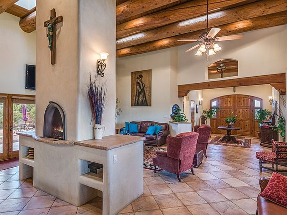 A grand hacienda nestled on approximately 8.4 private, tree studded acres with mountain views without the mountain roads. This property is ideal for those seeking a tranquil, country lifestyle with all of the conveniences of an in-town estate. Designed around a west courtyard with panoramic mountain & sunset views with a stone water feature, this single level home is an entertainer's dream. Beyond the grand entry, a towering two sided fireplace defines the separation of living room & the spacious, light filled country kitchen & dining area. The perfect gathering place & a chef's delight, the kitchen boasts a commercial grade gas range, two sinks, cabinets galore, an 8ft+ counter with bar seating & a true butler's pantry. The spacious master suite wing features French doors leading out to the west courtyard, a fireplace & office area (or meditation/exercise area). The second bedroom & bath have a private entrance. The third bedroom & bath connect to a den with kiva fireplace & wet bar -- perfect flexibility for Mother-in-Law quarters! The home features vigas, nichos, tile floors, skylights, a spacious laundry room & a fabulous personal salon! The separate metal garage is currently used as a workshop and has an attached caretaker's apartment on a separate septic system. This area of the property also features a run-in-shed for horses, portable corral panels & plenty of flat, usable land for an arena or expansion of horse facilities. (continued below)
