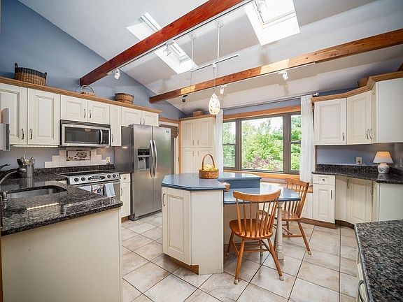 - Kit Dscrp: Window(s) - Picture, Main Level, Countertops - Stone/Granite/Solid, Deck - Exterior, Skylight, Flooring - Stone/Ceramic Tile, Breakfast Bar / Nook, Kitchen Island, Stainless Steel Appliances, Open Floor Plan, Ceiling - Beamed, Exterior Access
