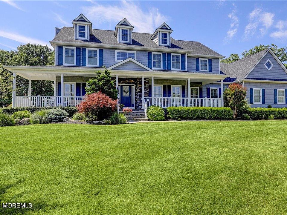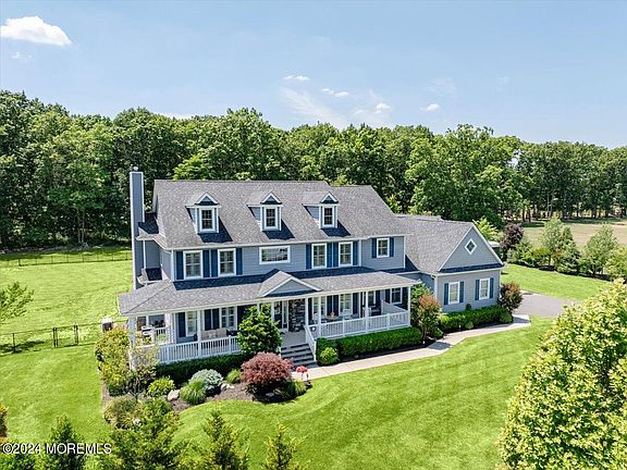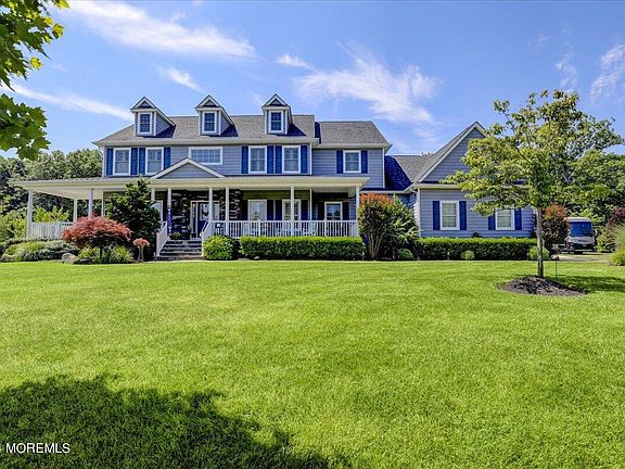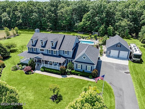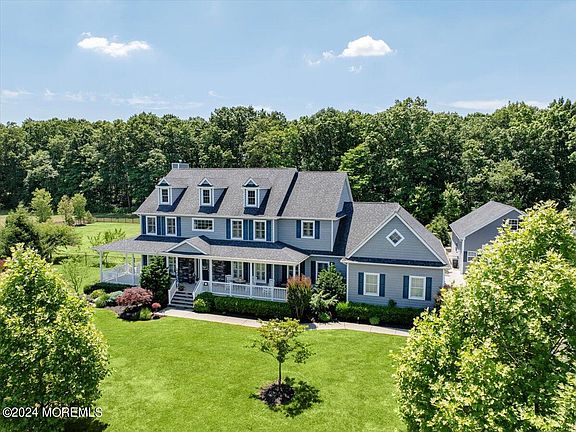 Nestled at the end of a serene cul-de-sac in Howell, 6 Princess Court is a stunning 7-years-young home that epitomizes luxury and modern living. This move-in-ready residence offers an exceptional blend of convenience and elegance. A charming wrap-around front porch beckons you to relax and soak in the tranquil ambiance, hinting at the exquisite details that await inside. Step into the grand entrance, where an inviting interior unfolds with hardwood floors and crown molding spanning nearly the entire home, adding an air of sophistication and warmth. The heart of the home is the gourmet kitchen, a culinary enthusiast's dream with its 42-inch cabinets, three ovens, upgraded stainless steel appliances, a sleek subway tile backsplash, a walk-in pantry, and direct access to the Ipe Brazilian wood deck, covered patio, recessed lights, and a ceiling fan creates an ideal space for outdoor dining and indoor/outdoor entertainment. Adjacent to the kitchen, the en suite guest bedroom offers double closets, plantation shutters, and recessed lighting, ensuring comfort and privacy for your guests. The formal living and dining rooms are perfect for entertaining, adorned with wainscoting, crown molding, and plantation shutters. Relax in the cozy den, featuring a gas fireplace and recessed lighting, the perfect spot for unwinding after a long day, or for setting up your work-from-home space. The laundry room, equipped with storage and outside access, adds to the home's practical conveniences. Upstairs, discover five generously sized bedrooms, each featuring recessed lighting and plantation shutters. The primary suite is a true sanctuary, boasting a tray ceiling, a vast walk-in closet with custom organization, and a luxurious bath complete with a jetted tub, a stall shower with multiple body sprays, a water closet, and double sinks. The second large primary en-suite bedroom has a beautiful bathroom and large walk in closet, and two additional bedrooms that share a well-appointed bathroom with a double sink and water closet complete the upper level. The finished basement, with its 9-foot ceilings, is accessible from both the main living area and the garage, and offers a full gym, a work room, a storage room, and built-ins, one of which leads to a hidden walk-in closet.. Outside, the expansive 2.52-acre grounds are professionally landscaped and feature a stamped concrete patio, a gunite heated pool with a hot tub, outdoor lighting, and an outdoor fireplace. The lush landscaping ensures privacy, creating a park-like setting perfect for relaxation and entertaining. Car enthusiasts will appreciate the attached three-car garage, complete with heat, AC, and a power washer. Additionally, the detached five-car garage, also equipped with heat and AC, features a car lift and a walk-up attic, providing ample storage and workspace. This extraordinary home has a whole-house generator and 400 amp service throughout, supported by two electrical panels, ensuring uninterrupted comfort and functionality. Situated on one of the newest streets in Howell, just a stone's throw from Wall Township and a few short miles from the shore area beaches, 6 Princess Court offers an unparalleled lifestyle in a prime location. With too many perks to list, this home must be seen in person to be truly appreciated. Don't miss the opportunity to own this magnificent property.