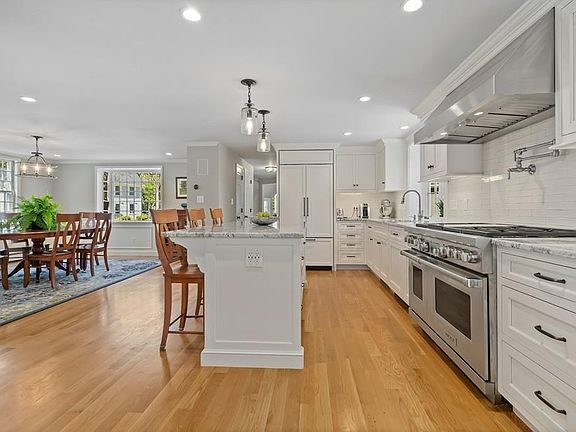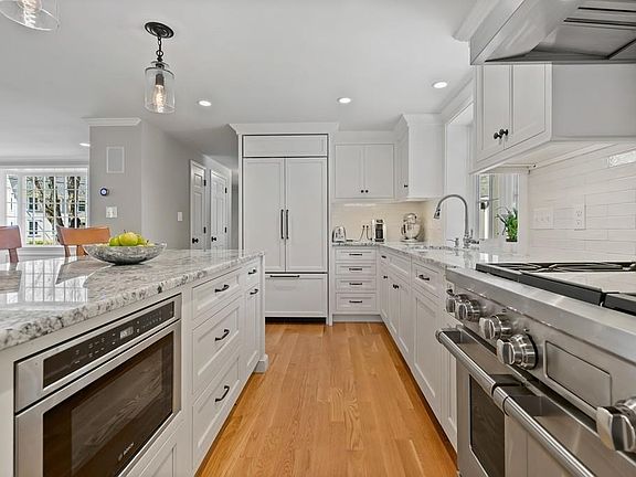 Spectacular center entrance colonial that has been masterfully updated, nestled in a lovely neighborhood, close to schools, shops & the highway.Since ownership this home has undergone a complete remodeling of the 1st floor in 2019 creating an exceptional open floor plan concept with a custom kitchen, center island, high end appliances,& granite counters.The adjacent dining room with bay window offers a more formal setting ideal for entertaining.This spacious home offers a cathedral ceiling family room, gas fireplace & direct access to the back yard and a front to back living room with fireplace.The second floor boasts a master suite with renovated bath & walk in shower.To compliment there are two good size bedrooms & office.The 3rd floor offers a bonus guest suite/au pair with full bath.Additional living space in the finished lower with wet bar complete the package.The grounds are perfectly manicured with a private fenced in back yard with pool & shed. This home checks all the boxes.