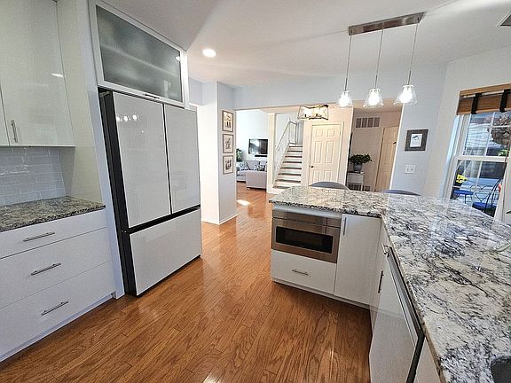 The recently renovated modern kitchen showcases high-grade granite countertops, European high-gloss, stain-resistant cabinetry, and full-height cabinets that create a grand, streamlined aesthetic. Top-tier Samsung refrigerator and dishwasher, along with a Sharp drawer microwave, complete this sleek and functional space.